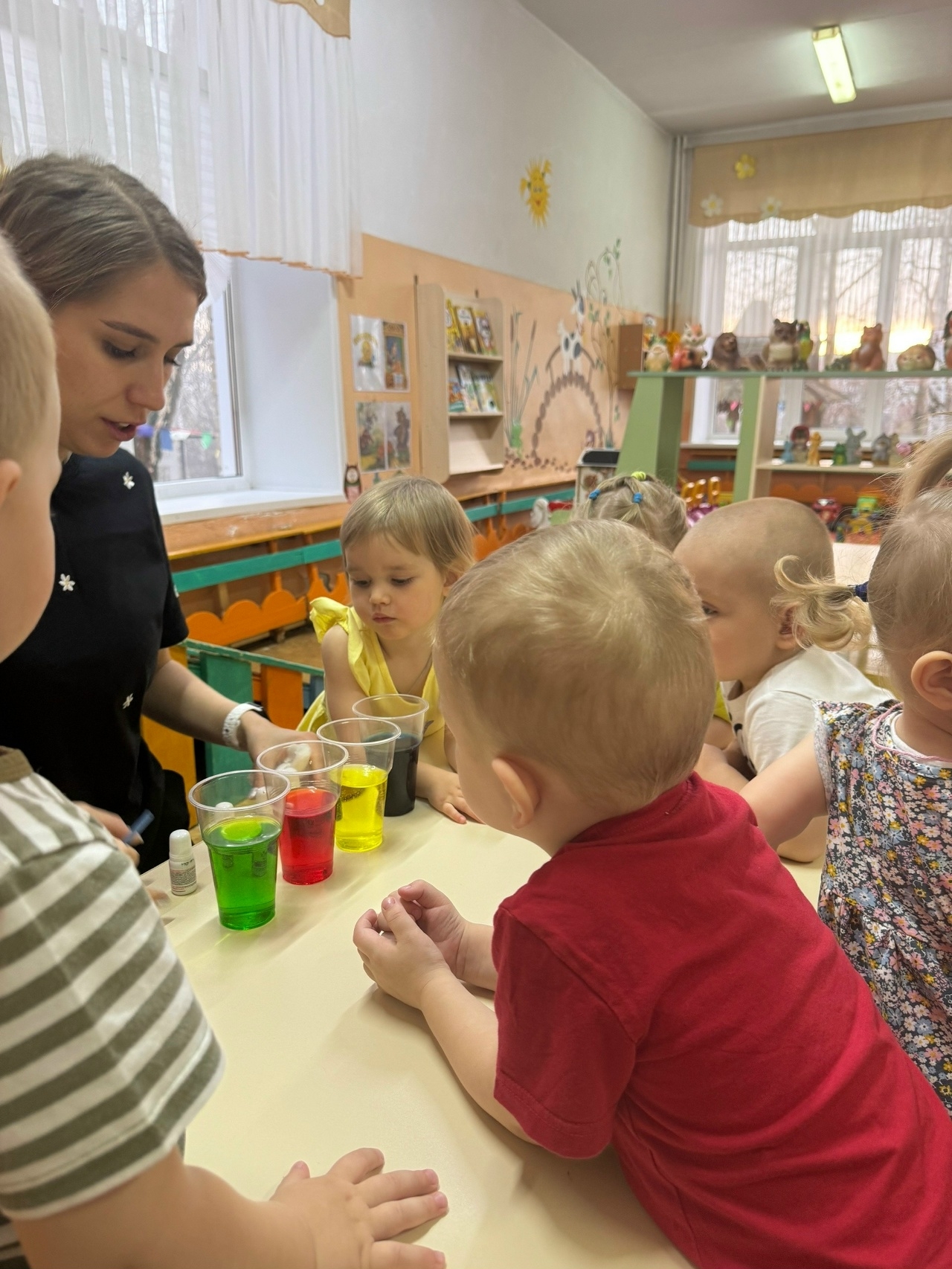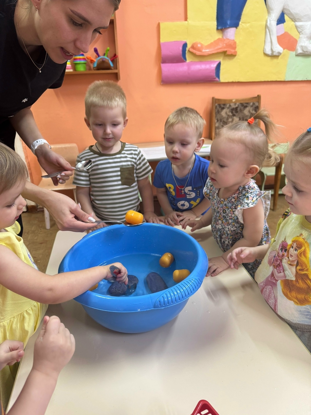 Дети были вовлечены в процесс на протяжении всего занятия. Малыши научились замечать простые свойства воды (текучесть, способность менять цвет, разное поведение лёгких и тяжёлых предметов в воде).